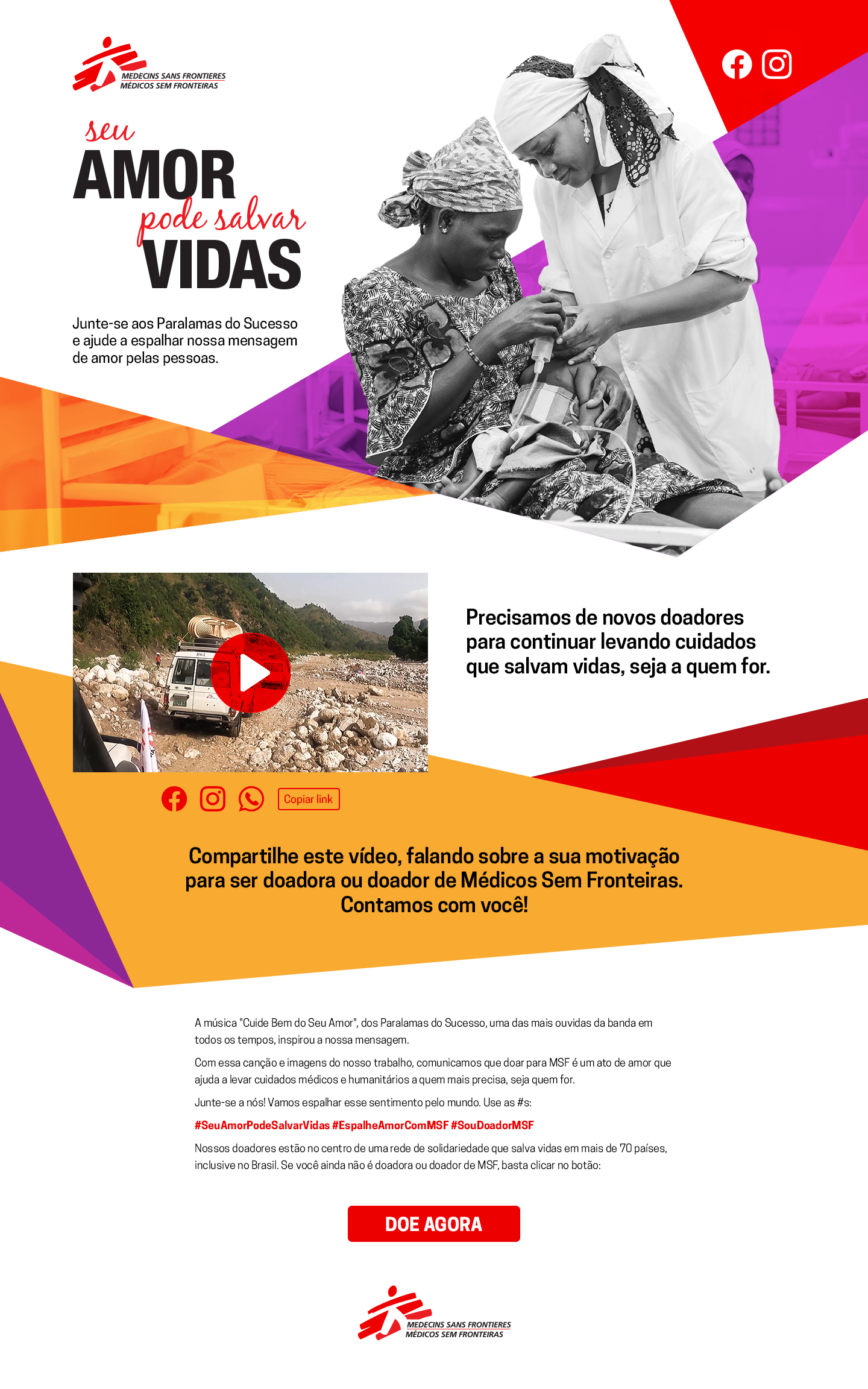 Para nós e para nossos doadores, cuidar é uma forma de expressar o amor ao próximo. Um amor que não encontra limites geográficos, étnicos ou ideológicos. Cuidamos bem do nosso amor, seja quem for. Amamos sem limites. Cuidamos sem fronteiras. Divulgação no Show do Paralamas do Sucesso Com “compartilhaço”, camisetas autografadas para novos doadores e transmissão e criação de landing page.