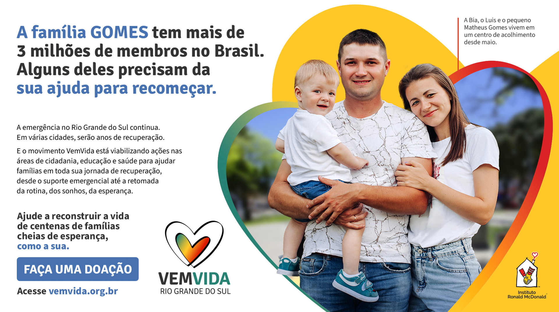 O Instituto Ronald, que há anos ajuda a impactar positivamente milhares de crianças, adolescentes e suas famílias a se aproximarem da cura do câncer, ampliou sua atuação, para acolher também as famílias impactadas por emergências, inicialmente, as que mais foram impactadas pelas enchentes que ocorreram no Rio Grande do Sul. Foi criado uma campanha digital de fundraising.